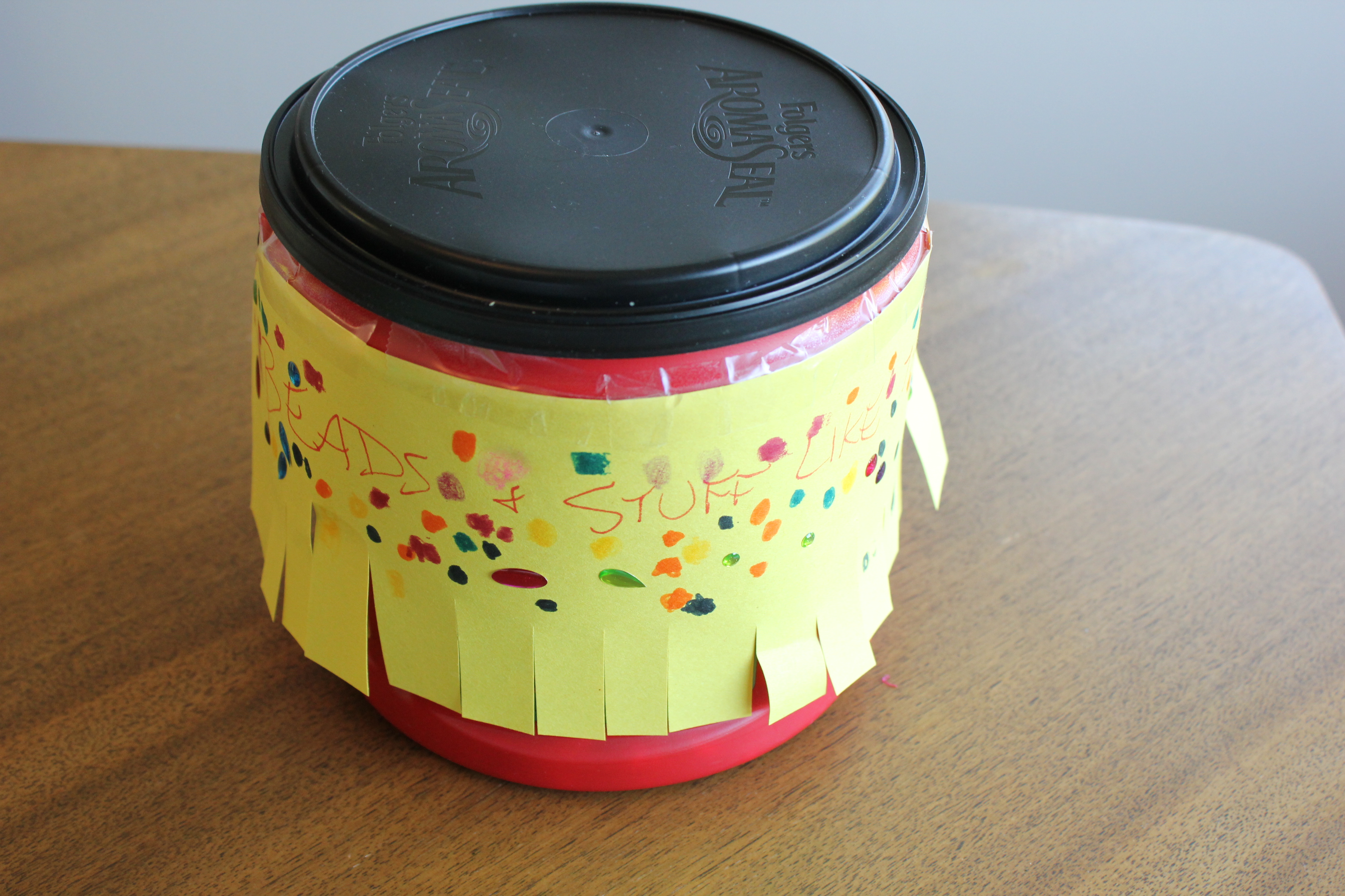 In our ongoing quest to save money, the coffee in the photo above is from another purchase of a huge, cheap tin. I tried to suck every penny out of that container by turning it into a craft project. But all I could think of was a bucket for beads, so I made this shoddy skirt and my daugher decorated it with gems.