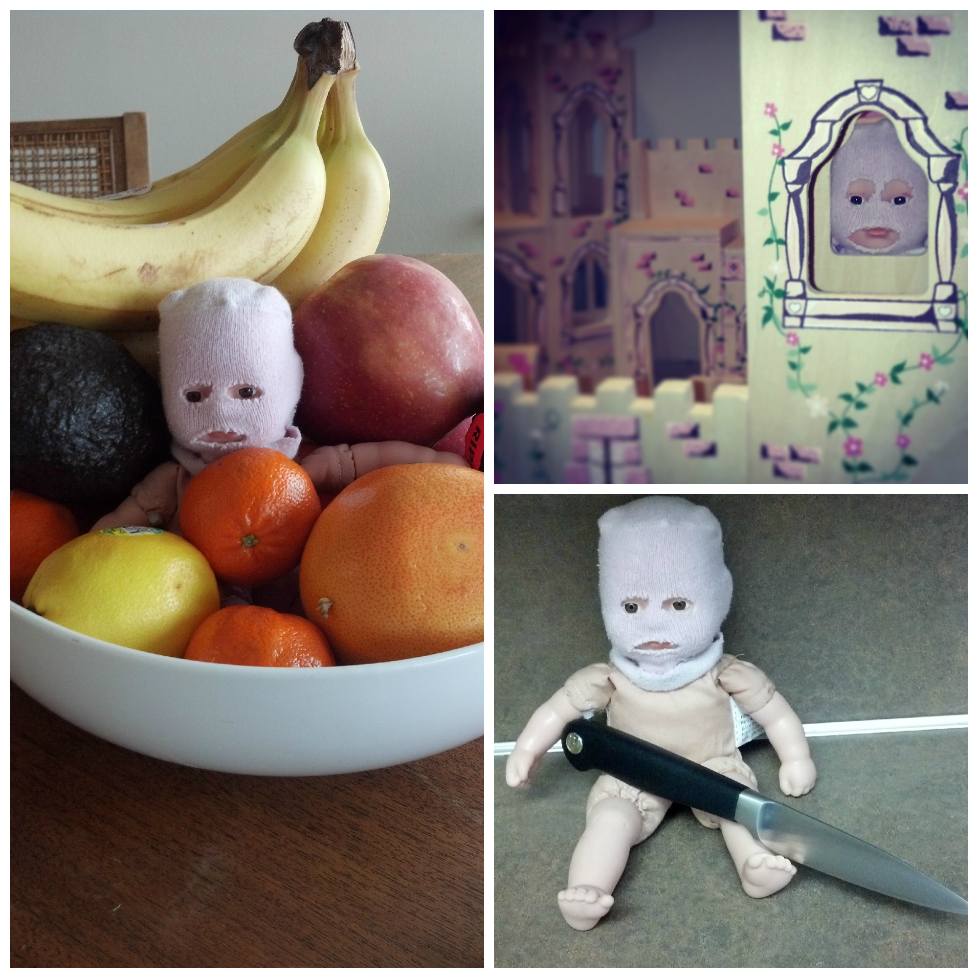 All you have to do is cut eye holes in an old sock, stick it on a doll of your choosing, take a photo of it in a humorous or menacing position, and share the creepy joy!