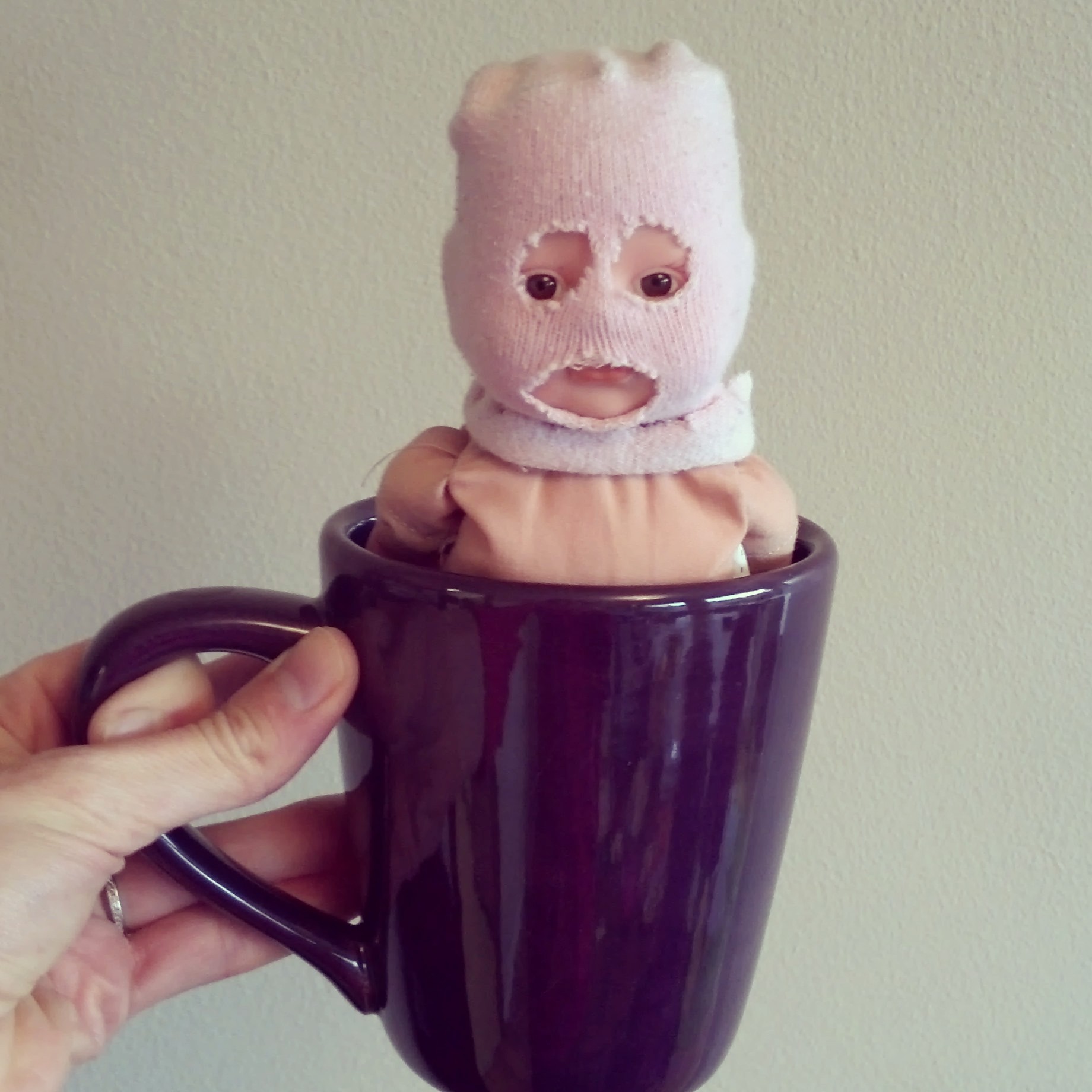 It’s like a play on words, but a play on a hashtag. You know, because Creepy Baby already looks like a mugger thanks to her ski mask. So you don’t have to do the coffee mug part. Just the doll. With a mask. Because then you have a babymugger.